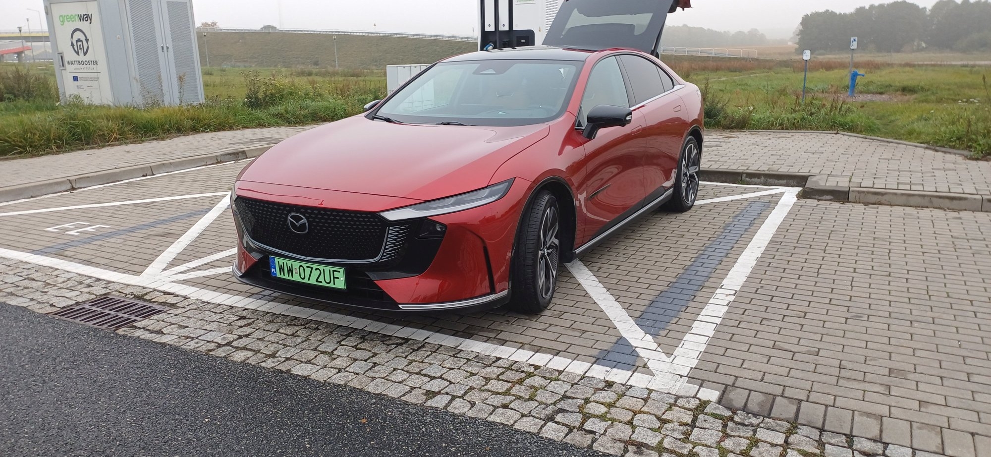 Przygodę z najnowszym japońskim elektrykiem rozpocząłem w salonie Mazdy w Warszawie na Aleji Krakowskiej 169. Otrzymałem do testów Mazdę 6e w bardzo ładnym czerwonym kolorze Soul Red Crystal.