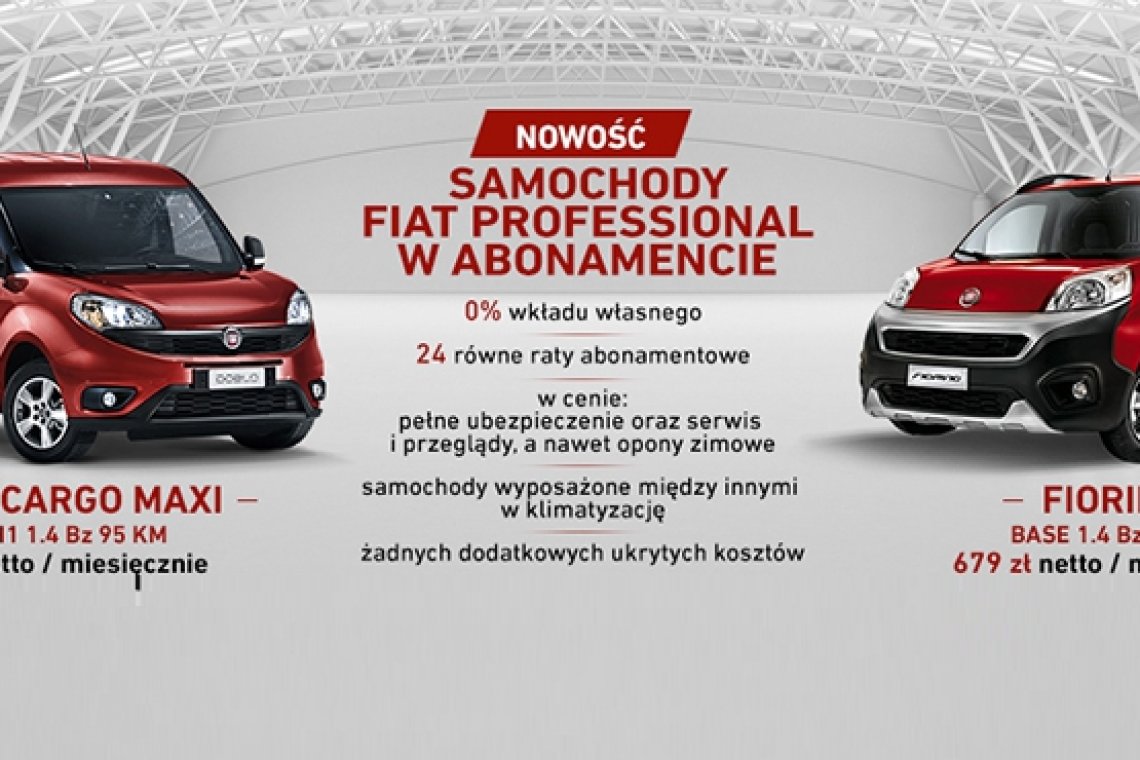 W odpowiedzi na rynkowe trendy, marka Fiat Professional wprowadza program finansowania samochodów dostawczych w formie stałego miesięcznego abonamentu. W zamian Klient otrzymuje fabrycznie nowy model Fiata Professional na 24 miesiące w wybranym przez siebie wariancie opłaty wstępnej (już od 0%) i rocznego przebiegu. Abonament pokrywa większość wydatków użytkowania pojazdu, a Klient ponosi tylko podstawowe koszty związane z jego eksploatacją, jak paliwo czy płyn do spryskiwaczy.