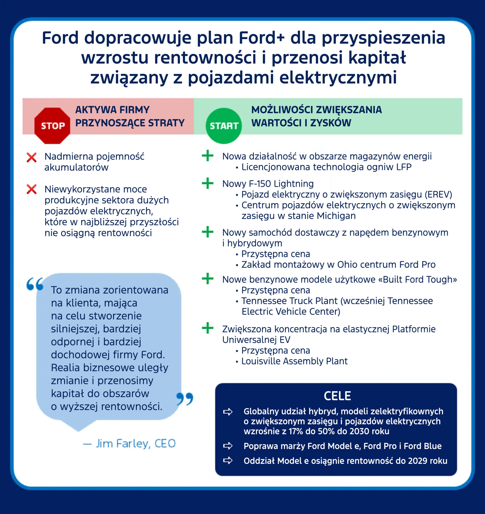 Realia biznesowe uległy zmianie i przenosimy kapitał do obszarów o wyższej rentowności: Ford Pro, nasze wiodące na rynku samochody ciężarowe i dostawcze, pojazdy hybrydowe oraz produkty o wysokiej marży, takie jak nowy dział zajmujący się produkcją magazynów energii.