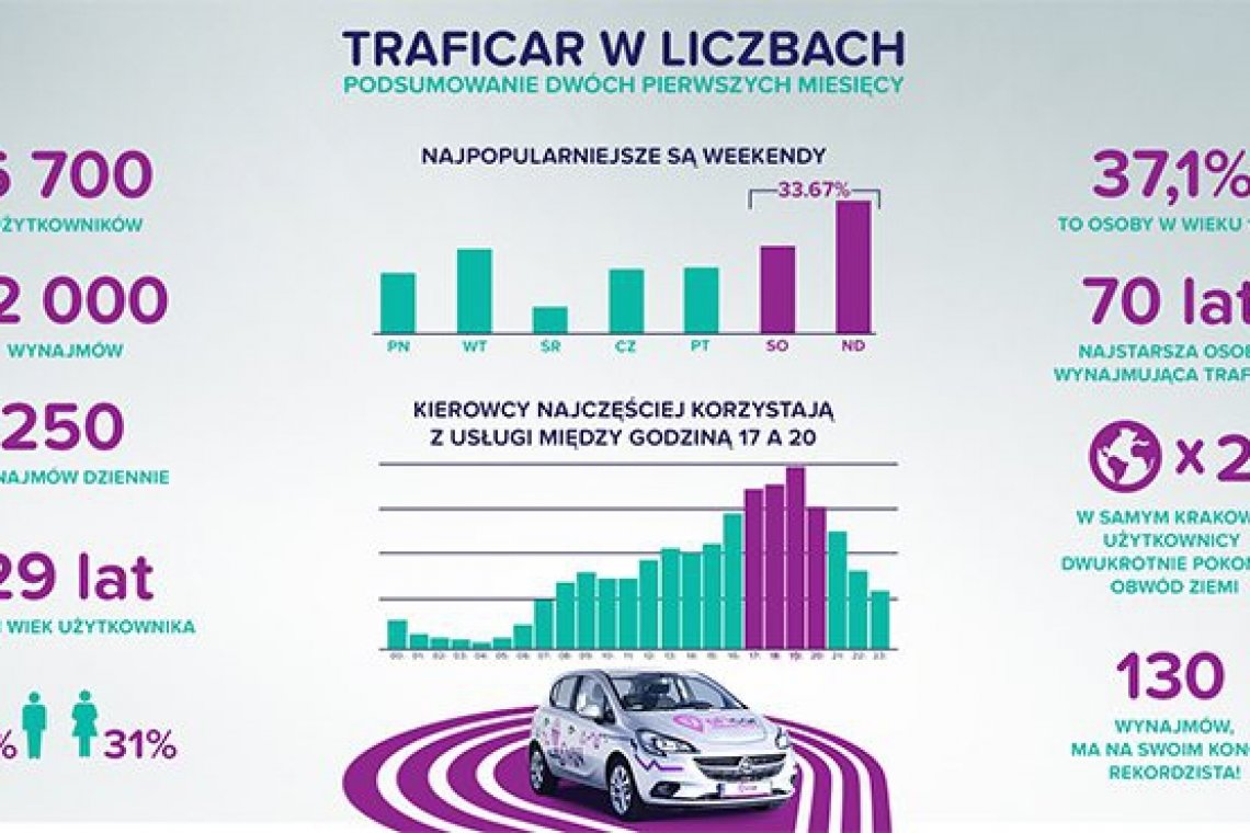 Do 1 grudnia w usłudze zarejestrowało się 6700 użytkowników, którzy wynajęli auta ponad 12 000 razy. Średnio dziennie odnotowuje się ponad 250 wynajmów. Z danych wynika, że 69% osób korzystających z traficarów to mężczyźni, 31% kobiety, a średni wiek użytkownika to 29 lat. Najliczniejszą grupą, bo aż 37,07%, dzielącą się samochodami są młode osoby w grupie wiekowej 18-25. Natomiast najstarsza osoba miała 70 lat. Okazuje się, że użytkownicy najczęściej korzystają z usługi między godziną 17 a 20, a najpopularniejsze są weekendy, jest to aż 33,67%.