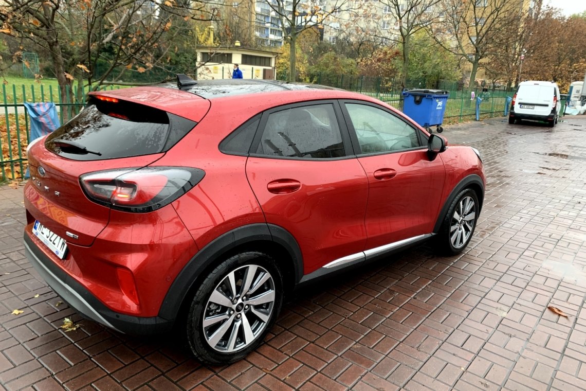 Pierwszą rzeczą, jaka nas, niestety, zaskoczyła, to brak automatycznej skrzyni biegów, po chwili rozmowy z przedstawicielem Forda okazało się, że Ford nie pomyślał jeszcze o wygodzie klienta w tym segmencie, przynajmniej w tym modelu, i skrzyni automatycznej na razie brak. Podchodząc do auta, duże wrażenie zrobiła na nas sylwetka, agresywna i lekko sportowa niczym przyczajona Puma, tylko trochę wyrośnięta ze względu na prześwit. Wsiada się do tego auta naprawdę wygodnie, mimo że linia dachowa jest poprowadzona dość nisko, to nie przeszkadza to przy wsiadaniu i nie ma ryzyka uderzenia głową w dach. Siadając za kierownicą, pierwsza rzecz jaka przyciąga uwagę, to duży wystający ekran na konsoli środkowej i drugi ekran, który zastępuje zegary. Nie jest to typowa hybryda, więc wyraźnie czuć i słychać pracujący silnik po odpaleniu. Informacje, które udało nam się uzyskać, to mały elektryczny motorek (14 KM)załącza się przy przyspieszaniu. W mojej ocenie jedyną zauważalną rzeczą, jaka o nim świadczy, jest ikonka, która po odpuszczeniu gazu pokazuje ładowanie baterii, oraz dość mocne poczucie odzyskiwania energii – samochód wyraźnie dohamowuje po puszczeniu gazu. Miłe zaskoczenie robi naprawdę dobre wyposażenie, ale też słono kosztuje ponad 120 tys. zł. Auto miało m.in. podwójnie dzielony szyberdach otwierany w części przedniej, elektryczną klapę bagażnika, bogate systemy bezpieczeństwa (asystent pasa ruchu, aktywny tempomat, wykrywanie przeszkód, samodzielne parkowanie itp. itd.). Myślę, że najbardziej doceniłem w środku ładowarkę indukcyjną, która ładuje sprawnie i szybko. Światła są bardzo dobre, szczególnie płynnie przełączają się między drogowymi i mijania oraz szybko wykrywają inne auta jadące z naprzeciwka. Fotele są bardzo wygodne, przynajmniej te z przodu, nie wiem, na ile jest to zasługa pakietu z elektronicznym pompowaniem poduszek w fotelach – jest również masaż, ale nie ma elektronicznego sterowania?! Podgrzewana kierownica i przednia szyba również na plus. Nie wiem, na ile przyda się w takim aucie, aż 5 trybów jazdy, my głównie jeździliśmy na trybie „Normal”, „ECO” i „Sport”. Różnice są wyczuwalne w poszczególnych trybach, ale głównie w sile przełożenia kierownicy oraz pod pedałem. Nie podobało mi się rozmieszczenie przycisków na kierownicy – są małe i zbyt blisko siebie, również panel sterowania temperaturą oraz dodatkami są zbyt nisko na konsoli, co powoduje oderwanie wzroku od drogi. Na plus bagażnik z podwójną podłogą oraz dodatkowym schowkiem. Widoczność z racji, że siedzisz wyżej i masz duże szyby również na plus.