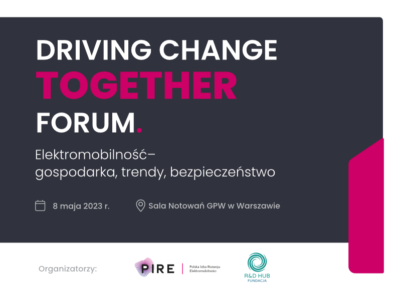8 maja br. obędzie się w Warszawie nowe wydarzenie w branży elektromobilności „Driving Change Together Forum”. Organizatorami Forum są: PIRE- Polska Izba Rozwoju Elektromobilności oraz Fundacja R&D Hub. Patronat medialny nad wydarzeniem objął Magazyn Fleet.