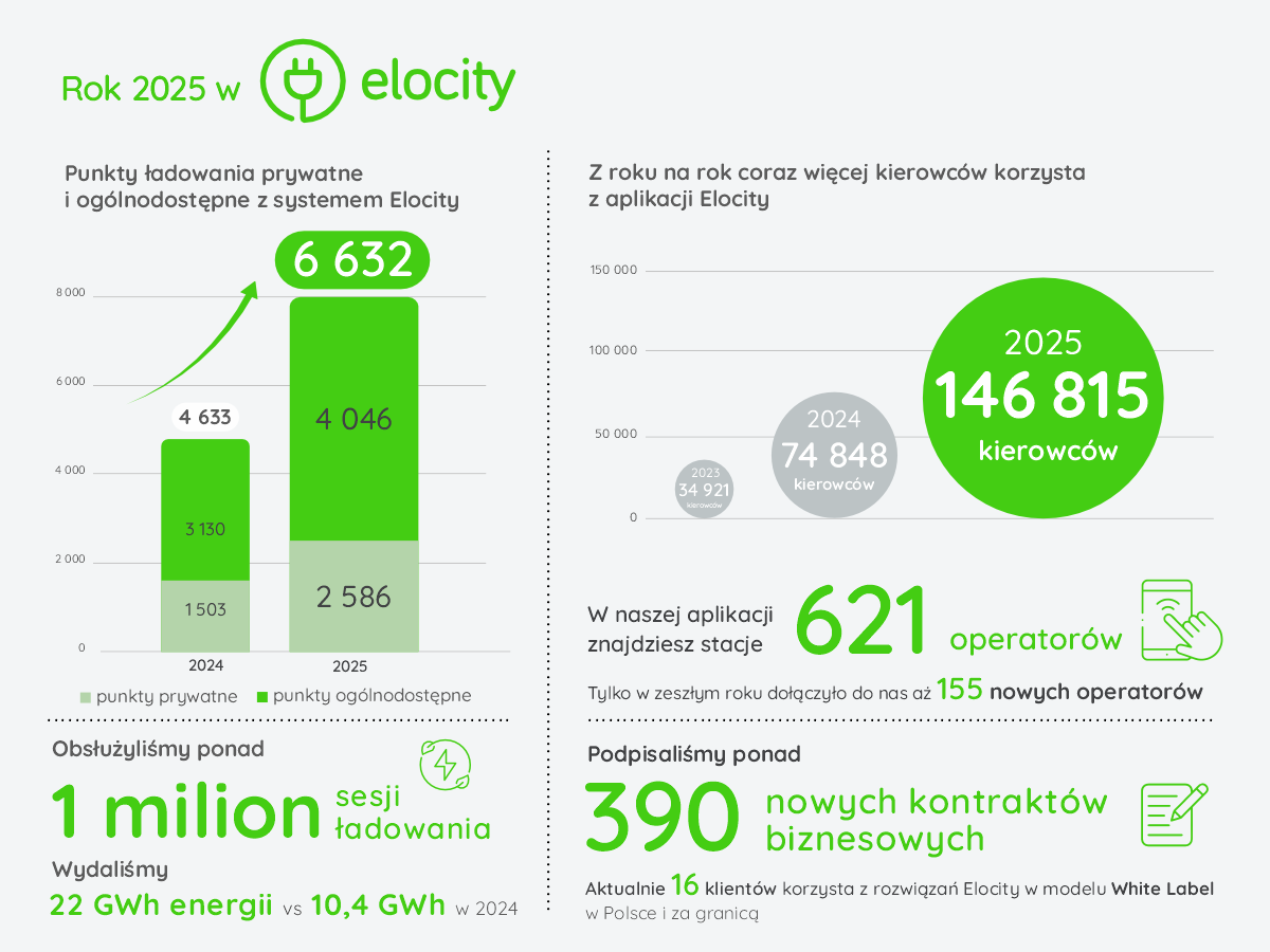Na koniec 2025 roku autorskie oprogramowanie Elocity obsługiwało 4 046 ogólnodostępnych punktów ładowania aut elektrycznych (o 29% więcej niż w 2024 roku. Wtedy było to 3 130 punktów). Dodatkowo w oparciu o software Elocity działa 2 586 punktów prywatnych. Równolegle, dzięki rozwojowi roamingu, aplikacja Elocity integrowała także stacje partnerskie, zwiększając realną dostępność infrastruktury dla kierowców. Tylko w 2025 roku do grona partnerów roamingowychElocity dołączyły m.in. BP, Shell, Kaufland, E.ON Drive, EDRI Poland, GO+E.Auto oraz ChargePoint.