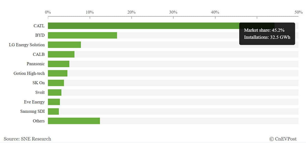 Przewaga CATL jest olbrzymia. Udział w rynku w styczniu 2026 wyniósł 45,2 proc. przy instalacji o łącznej mocy 32,5 GWh. Drugi BYD to zaledwie 13,8 proc. udziału.