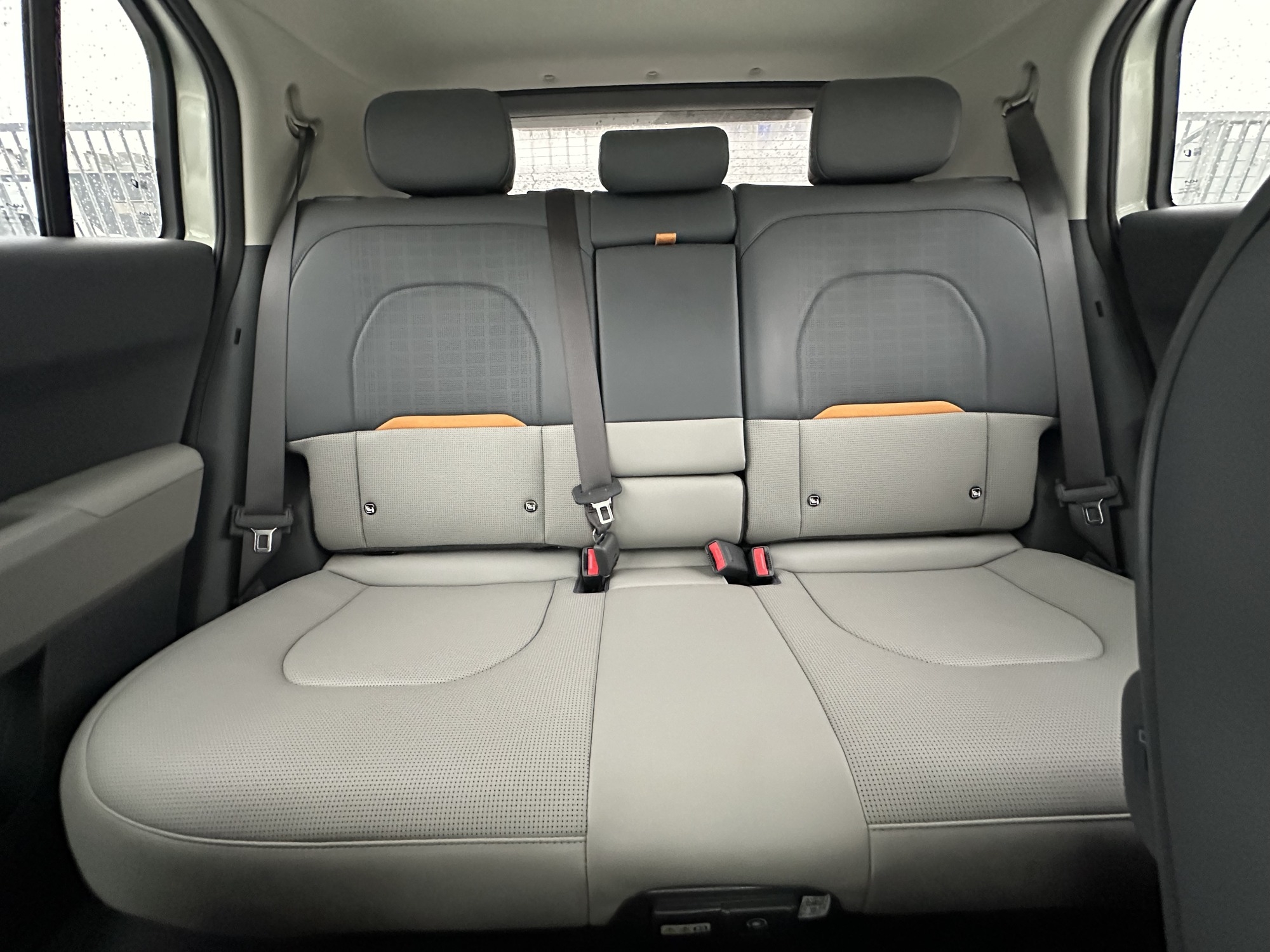 Kia dorzuciła do testowej EV3 pakiet CP1, czyli pakiet kolorystyczny. Trudno się dziwić, dla wersji Business Line jest bez dopłaty, a jak mówią darmo to dobra cena. Właśnie dlatego we wnętrzu mamy wegańską tapicerkę skórzaną, czyli coś w rodzaju skaju w kolorze grafitowo-jasnoszarym z pomarańczową wstawką w oparciu przednich foteli i tylnej kanapy oraz pomarańczowym wykończeniem wnętrza między kierowcą a pasażerem. Przyznajemy, że to znacznie ożywia wnętrze auta.