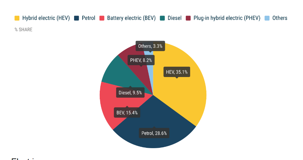 Modele hybrydowo-elektryczne nadal zyskują na popularności, utrzymując swoje miejsce jako najpopularniejszy rodzaj zasilania wśród kupujących.