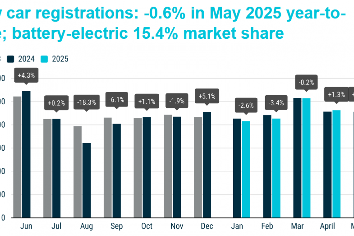 Do końca maja 2025 r. liczba rejestracji nowych samochodów w UE obniżyła się o 0,6% w porównaniu z analogicznym okresem ubiegłego roku. Niemniej jednak rejestracje rok do roku w maju zwiększyły się o 1,6% w porównaniu z tym samym miesiącem ubiegłego roku. Narastająco na koniec maja udział w rynku samochodów elektrycznych wyniósł 15,4%, co nadal jest dalekie od oczekiwanego poziomu.