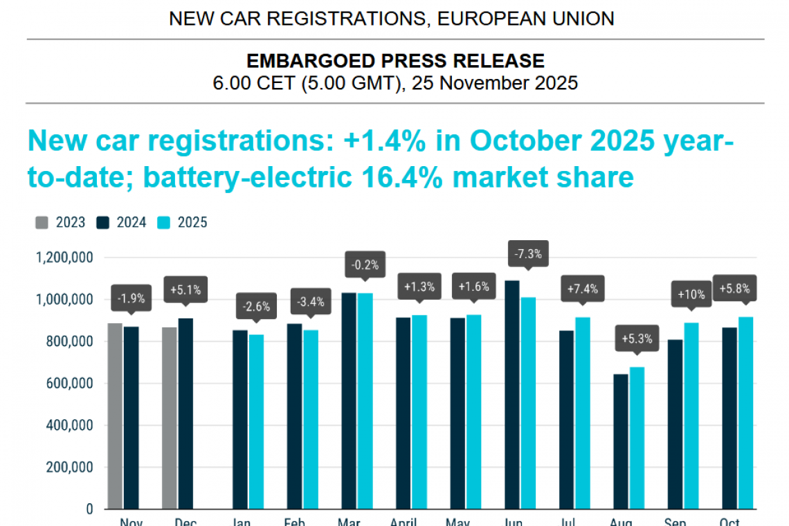 Od początku roku do października 2025 r. liczba nowych rejestracji samochodów w UE zwiększyła się o 1,4% w porównaniu z tym samym okresem ubiegłego roku. Październik był czwartym miesiącem wzrostu z rzędu.